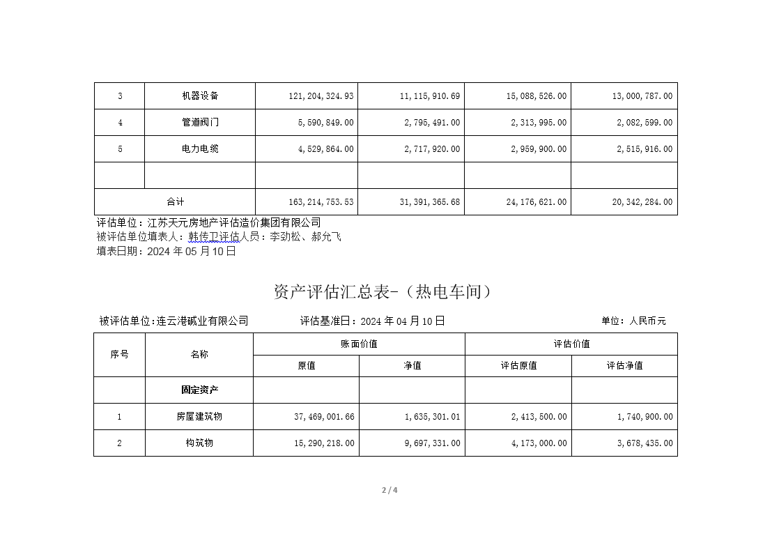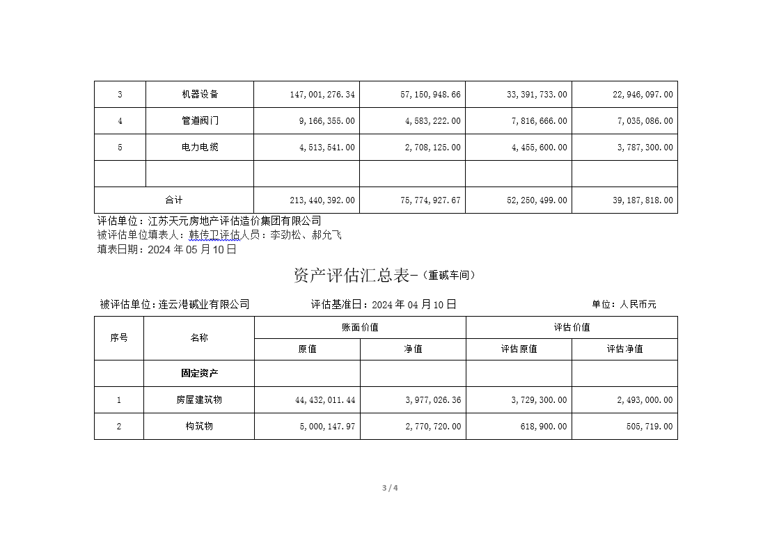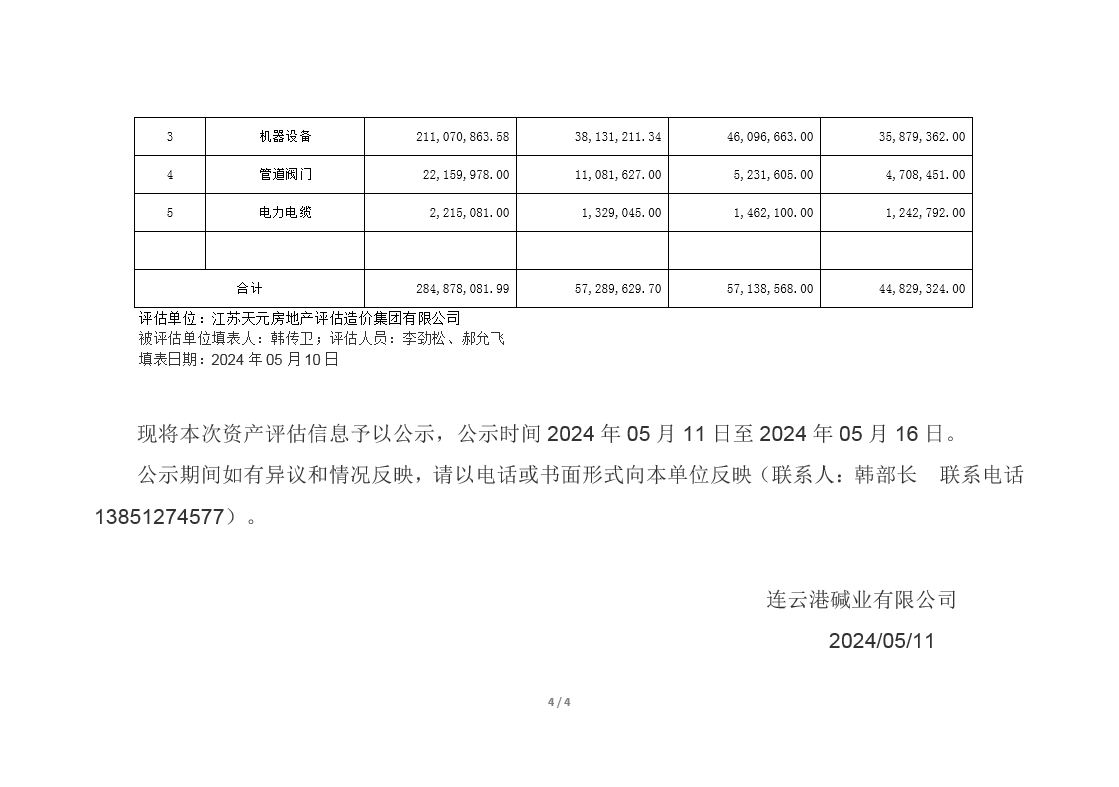 連云港堿業(yè)有限公司煅燒、熱電、重堿車間資產評估公示