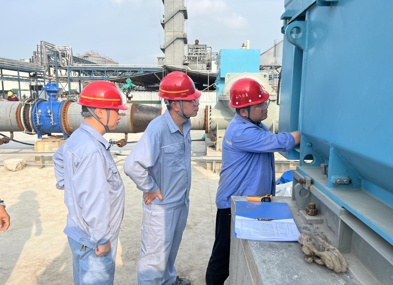 上午11:28,伴隨著“具備條件,啟動電機”指令的發(fā)出,操作人員按下空分循環(huán)水泵P820101A“啟動”開關(guān),電機開始高速旋轉(zhuǎn),隨后操作人員依次開啟P820101B、C??辗盅h(huán)水泵單機試車的現(xiàn)場“熱辣滾燙”,大家衣衫被汗水濕透,但熱情依舊高漲。操作人員每隔15分鐘就詳細檢查記錄電機的軸溫、轉(zhuǎn)速、振值等指標。
