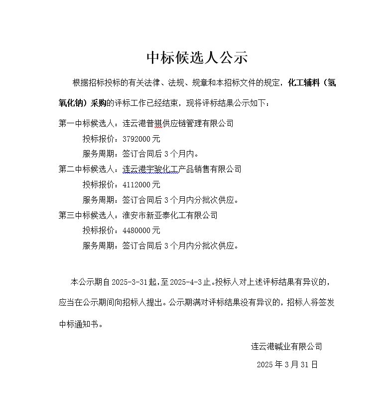 化工輔料氫氧化鈉采購(gòu)中標(biāo)候選人公示